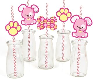 女の子 子犬 犬 ペーパーストローデコレーション ベビーシャワーや誕生日パーティー ストライプ装飾ストロー 24本セット
